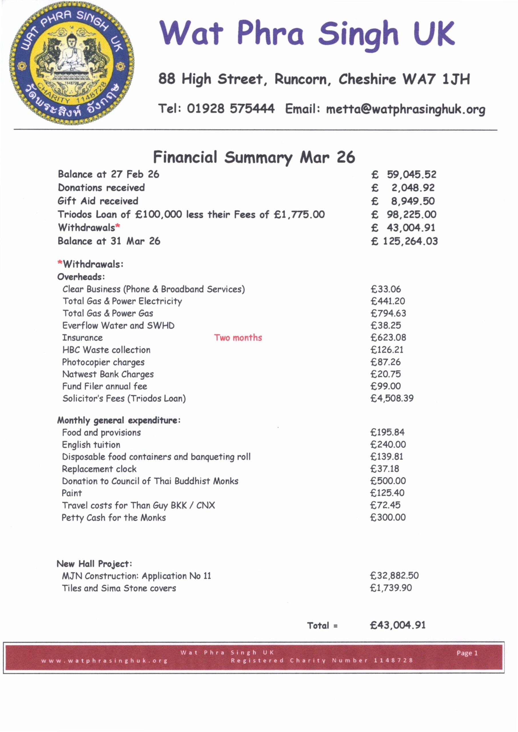 ในฐานะองค์กรการกุศลเพื่อความโปร่งใสกับการเงินในแต่ละเดือนได้มีการสรุปรายยอดเงิน และรายรับรายจ่ายทาง Facebook และบนประชาสัมพันธ์ของวัด ผลสรุปรายเดือนล่าสุดได้แสดงไว้ด้านล่างนี้